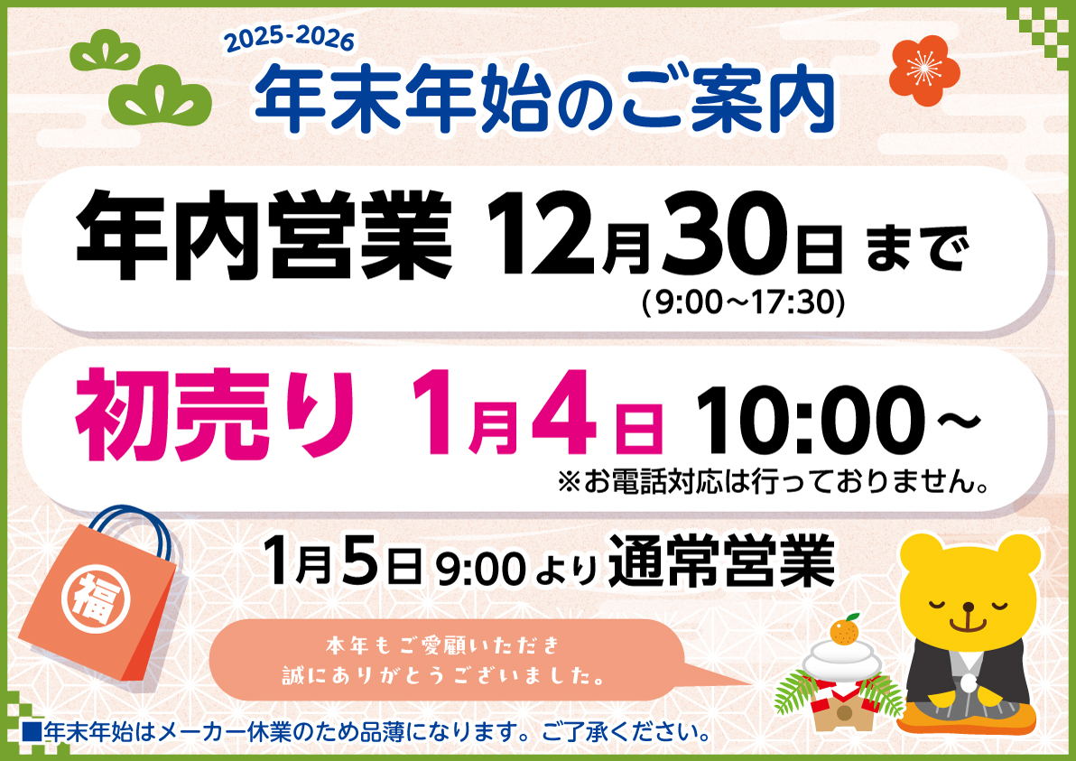 2025.12.24 2025-2026 年末年始休業について いつもヤマギシをご利用いただきまして誠にありがとうございます。 2025-2026年の年末年始の営業は下記の通りとさせていただいております。 年末年始休業期間中はご不便をおかけいたしますが、 何卒ご了承のほど、お願い申し上げます。