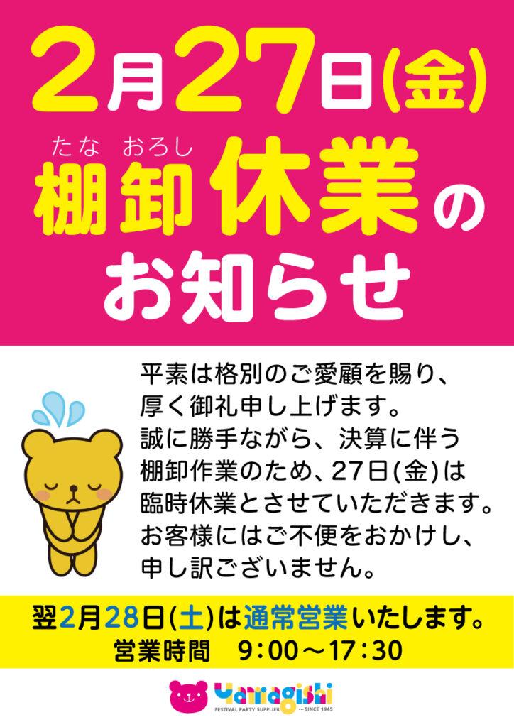 2026.02.19 2026年2月27日(金)棚卸しによる臨時休業のお知らせ いつもヤマギシをご利用いただきまして誠にありがとうございます。 2026年2月27日(金)は棚卸しのため、誠にご迷惑をおかけいたしますが お休みさせて頂きます。 28日(土)は朝9:00より通常営業となりますので、お客様のご来店をお待ちしております。
