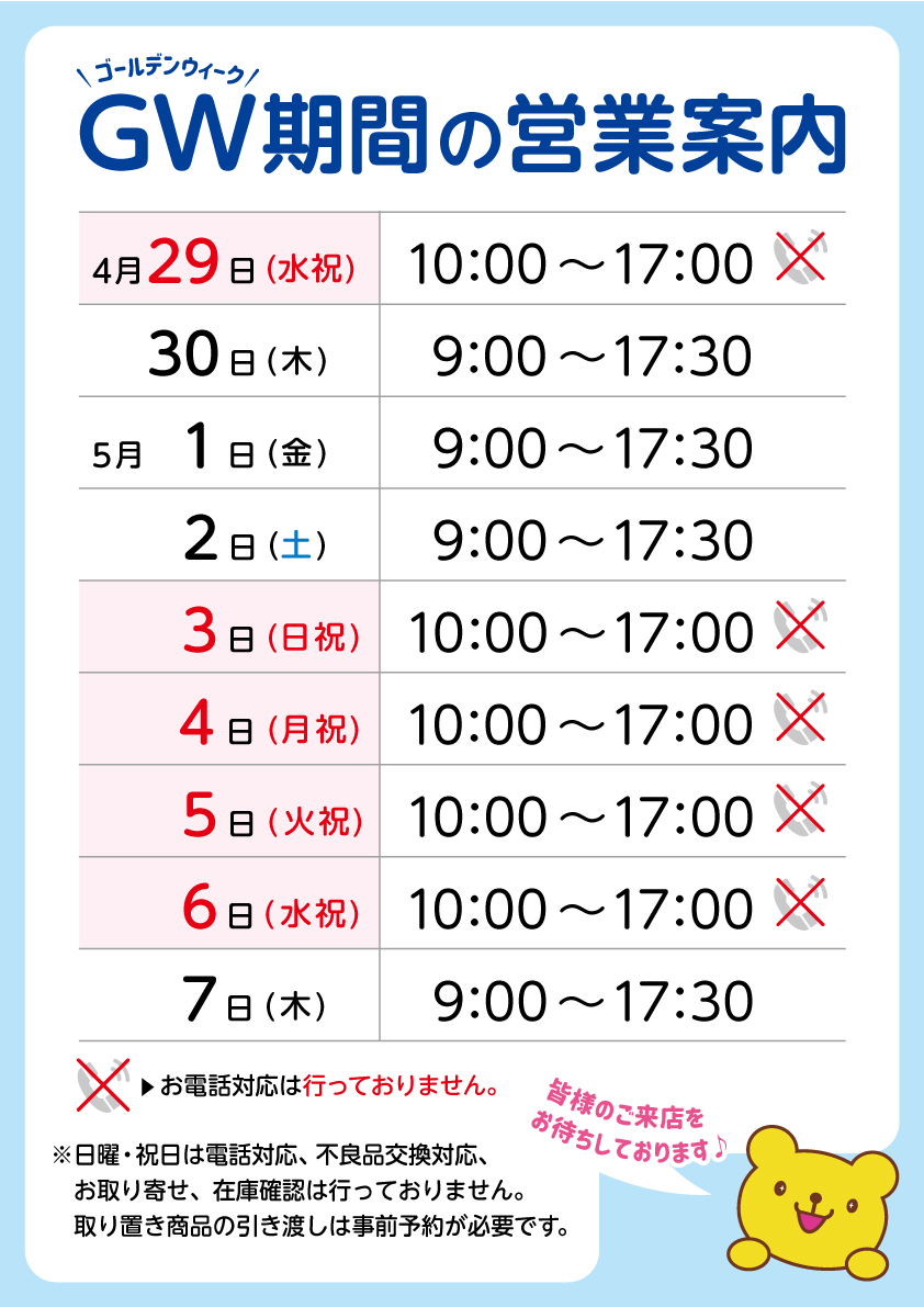 2026.04.28 2026年 GW 営業時間のお知らせ いつもヤマギシをご利用いただきまして誠にありがとうございます。 2026年のGWは下記の通り営業致します。 お客様のご来店をお待ちしております。